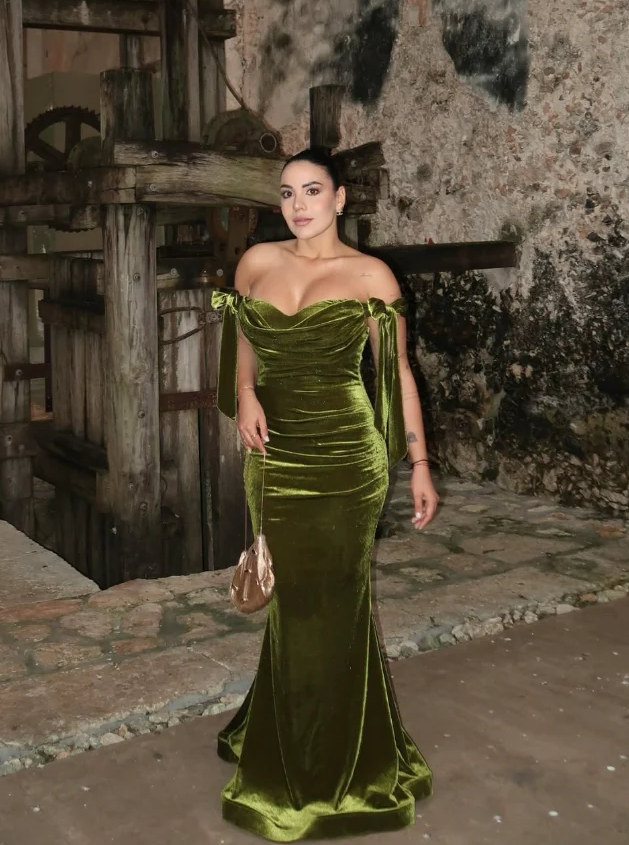 Elegant Mermaid Off the Shoulder Green Velvet Evening Dresses With Lace Up