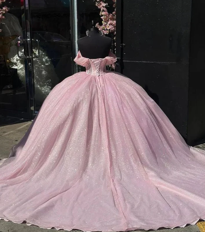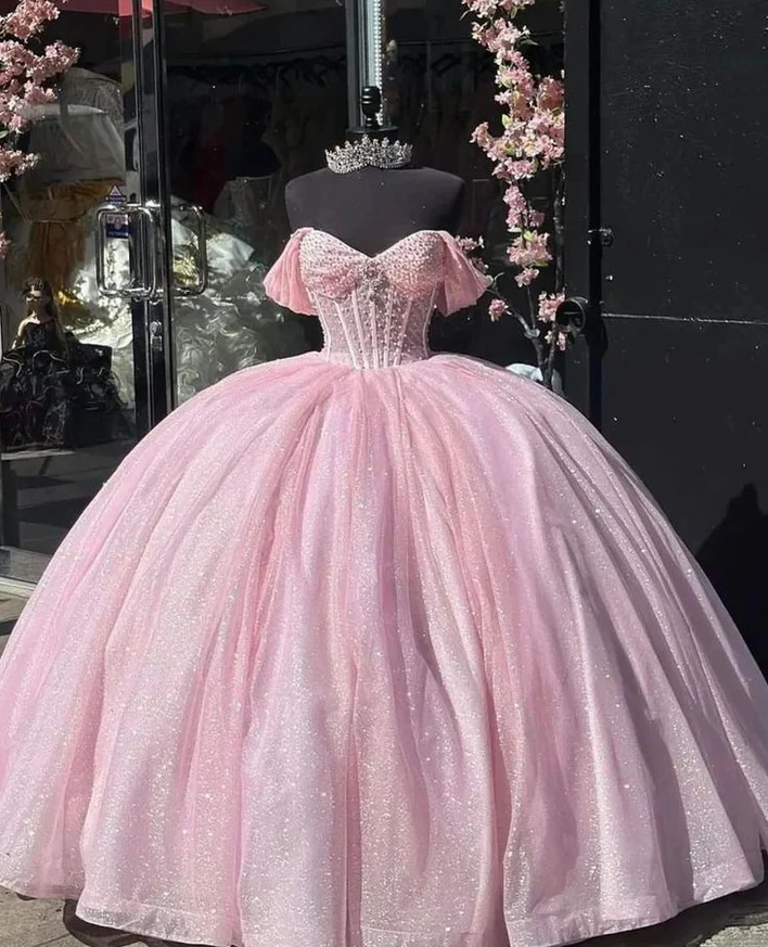 Off The Shoulder Baby Pink Tulle Prom Dress With Beading