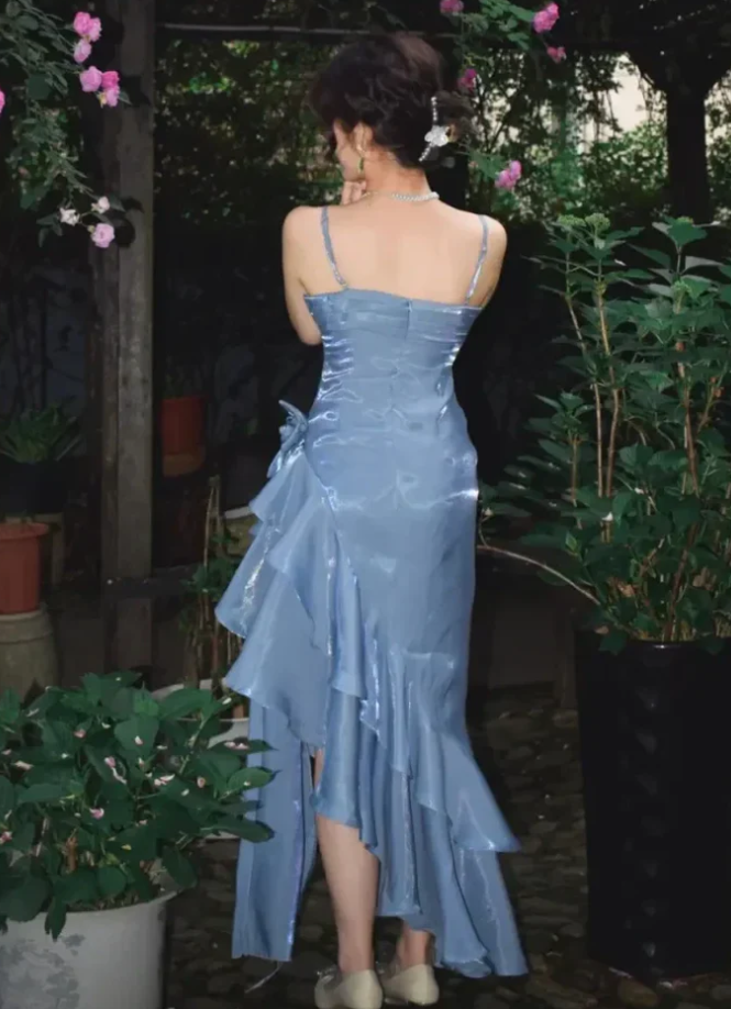 Vintage Light Blue Straps Floral Asymmetrical Hem Long Prom Dresses