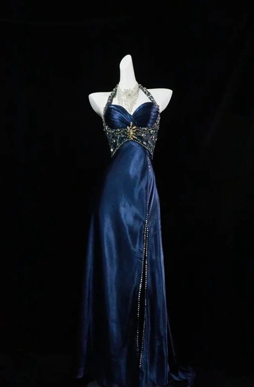 Vintage Halter Navy Blue Beaded Long Evening Dress