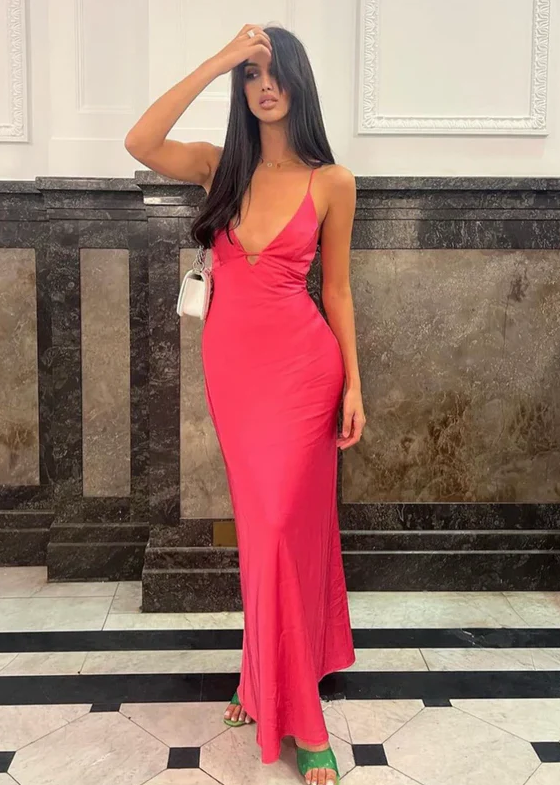 Fuchsia Simple V Neck Straps Long Party Dresses