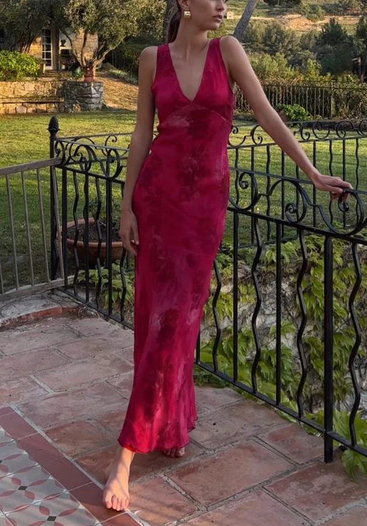 Charming Deep V Neck Satin Print Floral Prom Dress Long