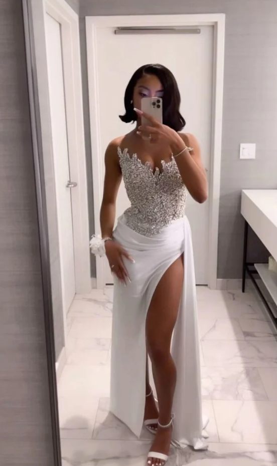 Sheath Beading Lace Appliques Split Long Prom Dress