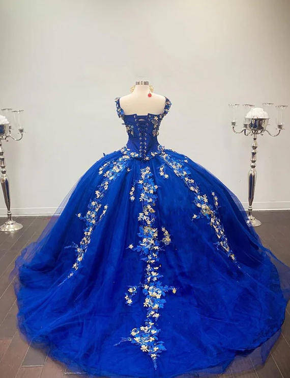 Off the Shoulder Royal Blue Ball Gown Quinceanera Dresses With 3D FLowers Sweet 16 Dress