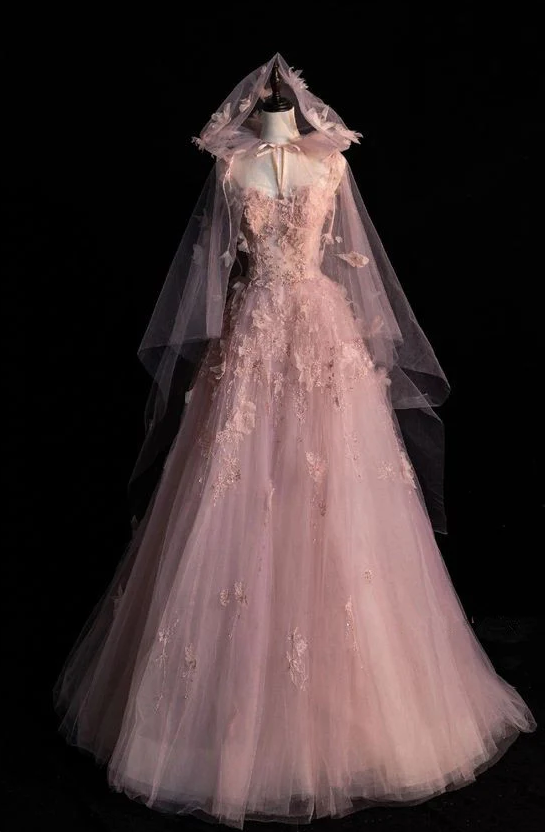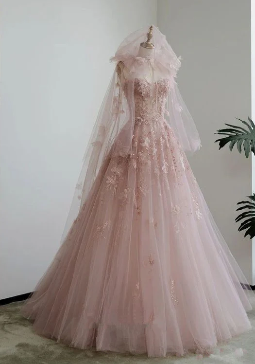Mermaid A line Spaghetti Straps Pink Tulle Prom Dresses