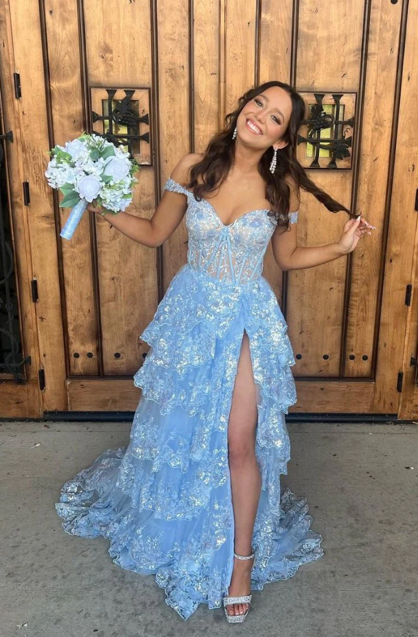 Off the Shoulder Blue Sequin Lace Prom Dresses With Split