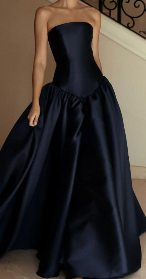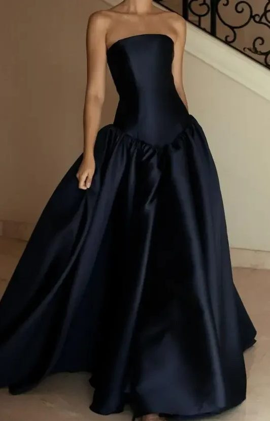 Strapless A-Line Navy Blue Satin Long Party Dress