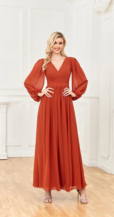 A Line V-neck long sleeved chiffon ruffled formal prom dress