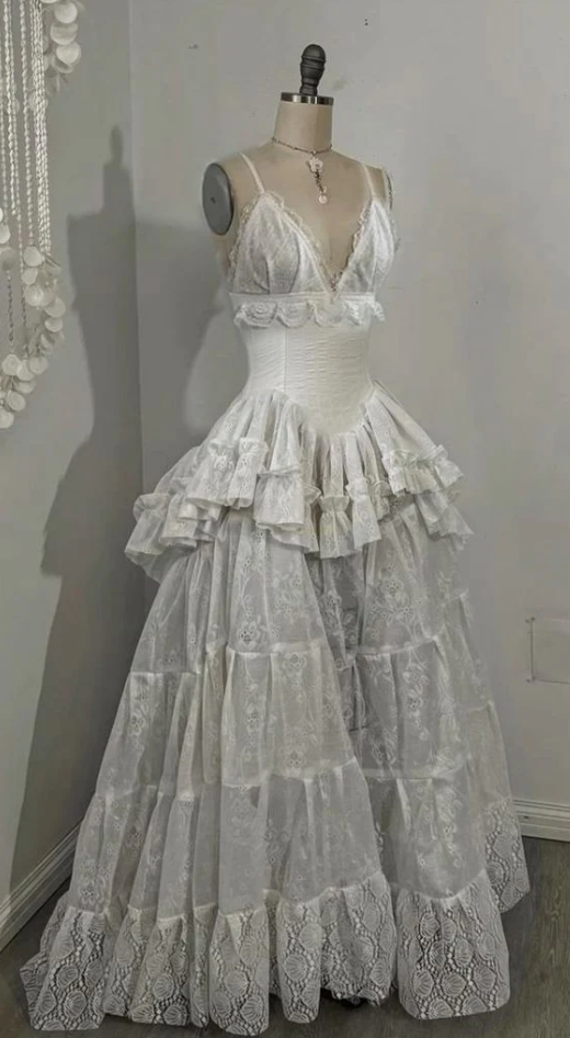 Vintage Retro V Neck Straps A-Line Lace Ruffles Evening Dresses