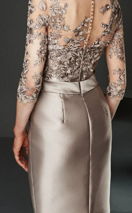 Tea Length Satin 3/4 Long Sleeves Mother of the Bride Dresses with Lace
